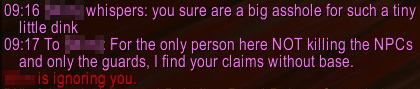Honestly, I couldn’t figure out why they were so ticked off. They saw me standing in a corner and killing the guards that spawned. I didn’t even glance at the 5 or so other NPCs that were next to me, only the guards. They watched me do this for about 5 minutes. Then they got mad about it. To be fair my response could be construed as a bit rude, but I was trying to explain that unlike the 2 other people that were currently killing everything in sight at the other end of town (poor poor tavern) I was just killing the guards, and was promptly given the cold shoulder via automated message. Can’t please everyone I guess, and while I must confess that for a moment I harbored bitterness about this, since I took such care to do it, that I even wavered on the thought of showing the young paladin what I COULD have been doing instead and followed her around killing any NPC she interacted with. This would have been mean. Very mean. I refused to let myself sink to the level of a common troll (not the darkspear kind, I like them. The trade chat kind.) and resisted the urge and continued with my plan.