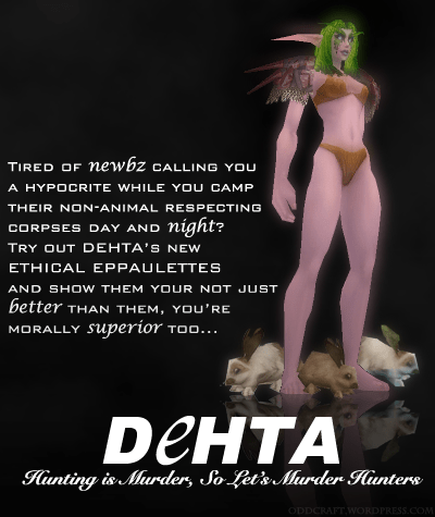 You would think it’d be enough for me to mock DEHTA about their shortcomings with Noblegarden last year, but I’ve had them slated for a good mocking for this item in particular for some time. I used to actually wear them around so I could claim that anything I did was ethical – including slaughtering herds of wandering rhinos for their deliciously juicy meats.