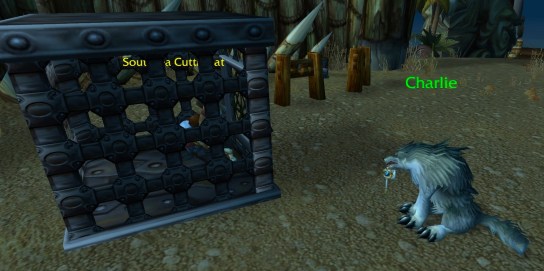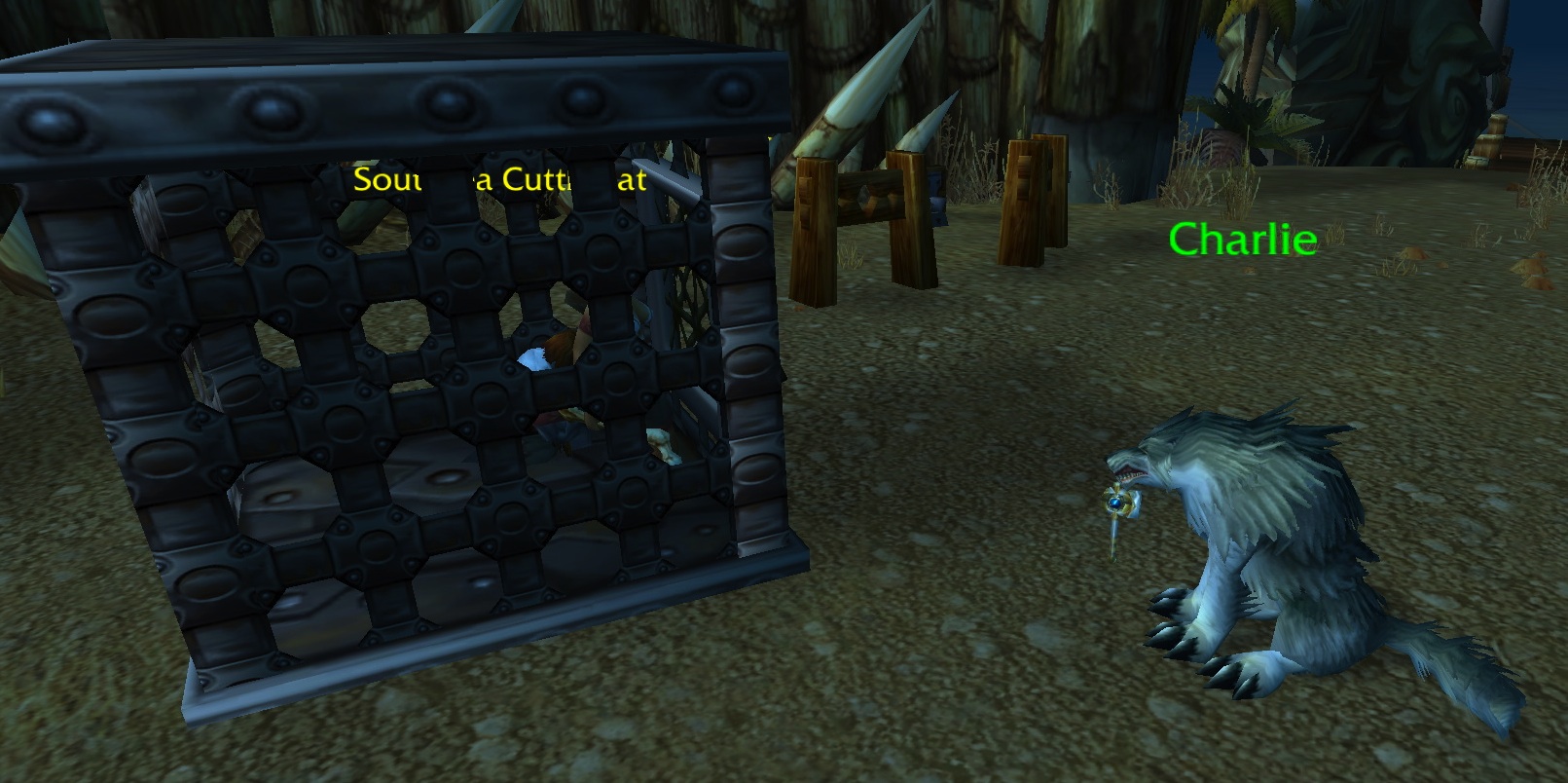 Now these references become a bit more interesting. This one can be somewhat easy to miss if you just rush by and miss some of the emotes that would draw your attention to it, especially since there’s no quest associated with it, although there is one near it. Just south of Ratchet, along the coast line there is an area where the Northwatch guard has taken control of the former pirate dock. The Horde will receive a couple of quests here including one that sends you to speak with Baron Longshore, who is comfortably sitting in a locked cage. However, sitting near the Baron is another group of Southsea Freebooters that will eventually speak to a nearby dog named Charlie. If you look closely, you’ll see that Charlie is holding what appears to be a key in his mouth.