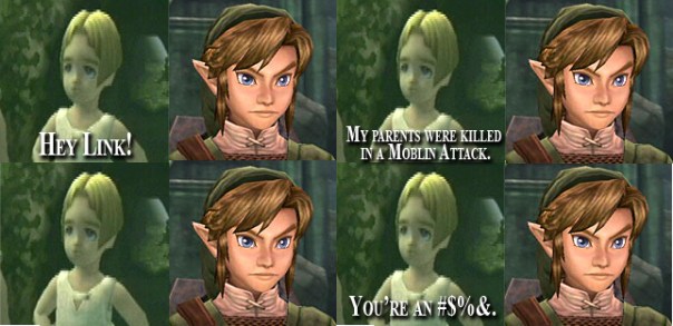 Well how about a complete lack of any and all emotion?! Annoying little brat doesn’t show the slightest bit of empathy for the majority of the game. In fact he has three emotions: Default Link (Grimace), Happy Link (slightly upturned scowl), and Surprised Link (Open mouth gaping grimace). That’s the entire emotional range of this kid. Heck, he shows more emotion in his wolf form than his human form. This is what I couldn’t stand in Twilight Princess more than anything! Even in the worse of circumstances, our “Hero” comes off as a unemotional sadist like so:
