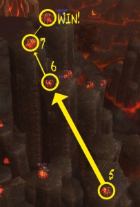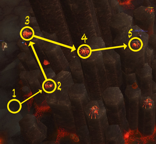 Step 1 is essentially the ground.  This spot is around the south-east corner of the hill. From there you just follow the numbering patterns.  I did this on a paladin using just my Judgement, so making sure I had line of sight was important to getting up the hill.  This pattern successfully got me half way up the hill without a single incident of having to backtrack because I couldn’t find another spider to smack.  However, be warned, if there are a few people doing this at once these spiders take a while to respawn.  Also keep in mind that if someone is chilling in one spot and repeatedly killing a spider to ensure you can’t progress that it is griefing. Report them.