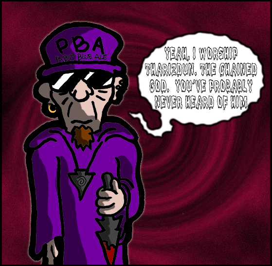 There’s a bit of a running joke in our D&D group. See in 4th Edition, The Chained God Tharizdun, is kind of portrayed as the long lost evil deity whose name has been lost to the ages because he was imprisoned at the dawn of time. His true name is rarely if ever spoken, and most don’t even know he exists. However, he is described as having “a few scattered cults of demented followers”. Needless to say, while we were all shooting the breeze about stuff like the Dawn War, the difference between Devils and Demons, and various other lore related topics during a game a few weeks back, I couldn’t help but burst out laughing when the following image popped into my head. It was too perfect. Why didn’t see it before?