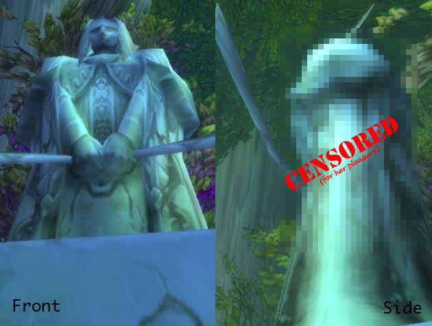 Okay, I swear I’m not the type of person who sees this kinda stuff in other places (abstract art, modern art, Disney movies) but I can’t be the only who has ever noticed this. I don’t think it was intentional Blizzard’s part, but let’s delve into this with the eyes of a nutjo… I mean ‘Freudian Psychologist’ and analyze what this means. This statue probably dates back to the Highborne, I mean you see the same statue in a couple of Highborne ruins at least, so you have a matriarchal society. Which begs the question of if women are often sexualized due to a patriarchical society, is the reverse true? Would the men of the Quel’dorei be as sexualized as women are in our society?