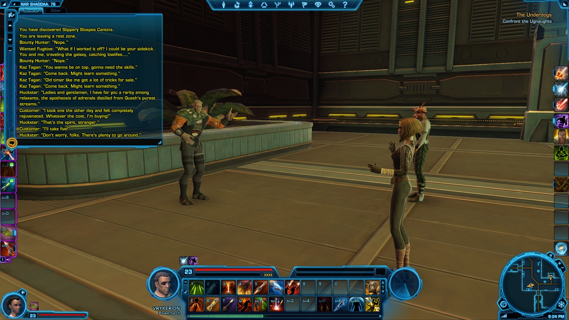 This image is probably the first “odd” from SW:TOR that I stumbled upon. If you can’t gather the subtext from the text box, essentially one of the customers is in on the hustle and their duping the other customer into buying the adrenals he’s trying to sell. Honestly, what really sold me on this little scene (one of MANY you can find in the game if you just wait around for them) is that it’s never made explicitly clear that one of the customers is in on the scam, unless you have seen or heard about this kind of scam before. Not that it’s exactly rare. It’s been played out in dozens of films, TV shows, etc. But I do like that it’s not explicit, it just makes it feel more… I dunno. Real?