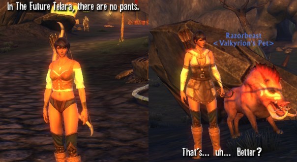 Deciding on a character wasn’t hard. You have a choice between some God Freaks or a bunch of technology orientated heretics who believe in “making their own miracles”. Uh… Yea. Defiant all the way. I just don’t get the rationale of playing a character who’s beliefs are “I’ll just wait and the Gods will do it for me.” On top of that, the male models for most races are pretty damn ugly. Like Orc ugly. Yes, even humans. So I went with a woman. I chose the Rogue path for her because it allowed me to be a pet-class hunter and later maybe switch to stealthy stabby stab rogue, but also because the hunter version plays ALOT like it has no auto-attack which is more comfortable after months of SWTOR. And since Vrykerion sounds weird as a girl name in my head, I’d like you all to meet Valkyrion (see what I did there?):