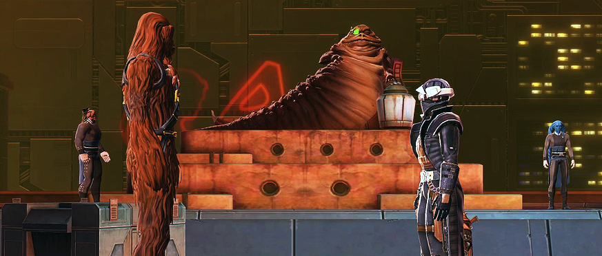 You know, it never occurred to me until this point that despite it being essentially the Hutt capital not many class stories actually deal with the giant slugs themselves.  I mean granted a lot of the time you are there for some kind of clandestine operation and getting the authorities (if you can call them that) would be detrimental to your cause.  But would be really be so hard to say “Hey, have you seen this guy? Also, here’s a thousand credits. You never saw me.”  I dunno.  Nar Shadaa seems like an easy place to buy people off is all I’m saying.