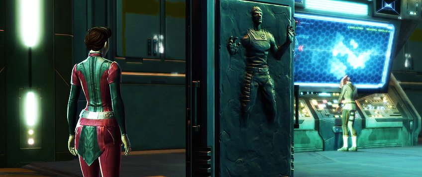 That soon is actually soon for once as it comes right after your next and final delivery – the man frozen in carbonite – to a medical facility on Nar Shadaa.  It’s there that the man is unfrozen and is revealed to be…  DUN DUN DUN! Nok Drayan himself!  The legendary space pirate himself! In the flesh!  And cyborg bits!  And in a stranger twist… DUN DUN DUUUUUUUN! He’s Risha’s dad!  Did we just stumble upon a soap opera episode?  Who changed the channel on my computer?  It seems old Nok is dying from a horrible disease inflicted on him by a mutinous crew years ago.  Before he dies though, he wanted to ensure that his family’s fortune was found and retrieved.  He froze himself in carbonite with instructions for Risha on all the things she’d need to gather to get to the fortune which is on a ship headed directly for a black hole.  Nok promises you the entire fortune save one family heirloom which is reserved solely for Risha.  That heirloom being the family crown.  See Nok’s not just a pirate king, he’s an actual king.  The King of Dubrillion to be precise.  The Drayan line is the rightful rulers of the planet, but they were ousted years ago.  Meaning Risha is a princess.  Because every scruffy looking smuggler type needs a princess to romance.  (Does that mean now that Disney owns the rights that Risha is a Disney Princess?)